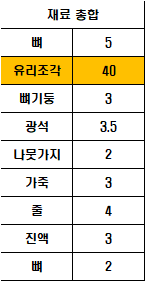 - 재료 파편가공 (단단함<공격력>Lv.2/ 낮은밀도<내구도->Lv.2) : 다듬은 재료 + 유리 2개