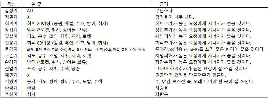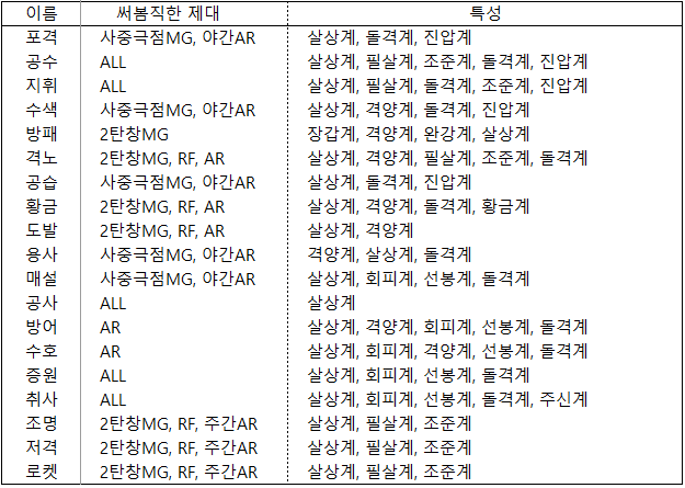 치명피해가 높고 화력이 낮은 요정은 2탄창MG, RF, 주간AR을 추천에 넣었으며