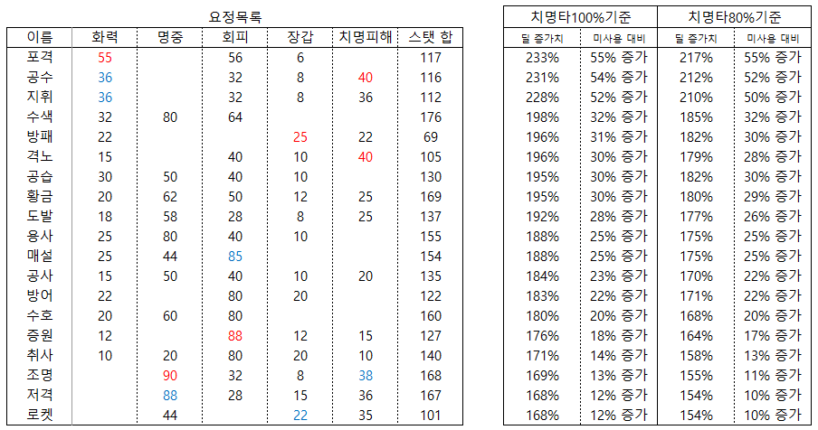 화력과 치명피해를 연산하여 치명률 100%기준, 80%기준으로 정리했습니다.