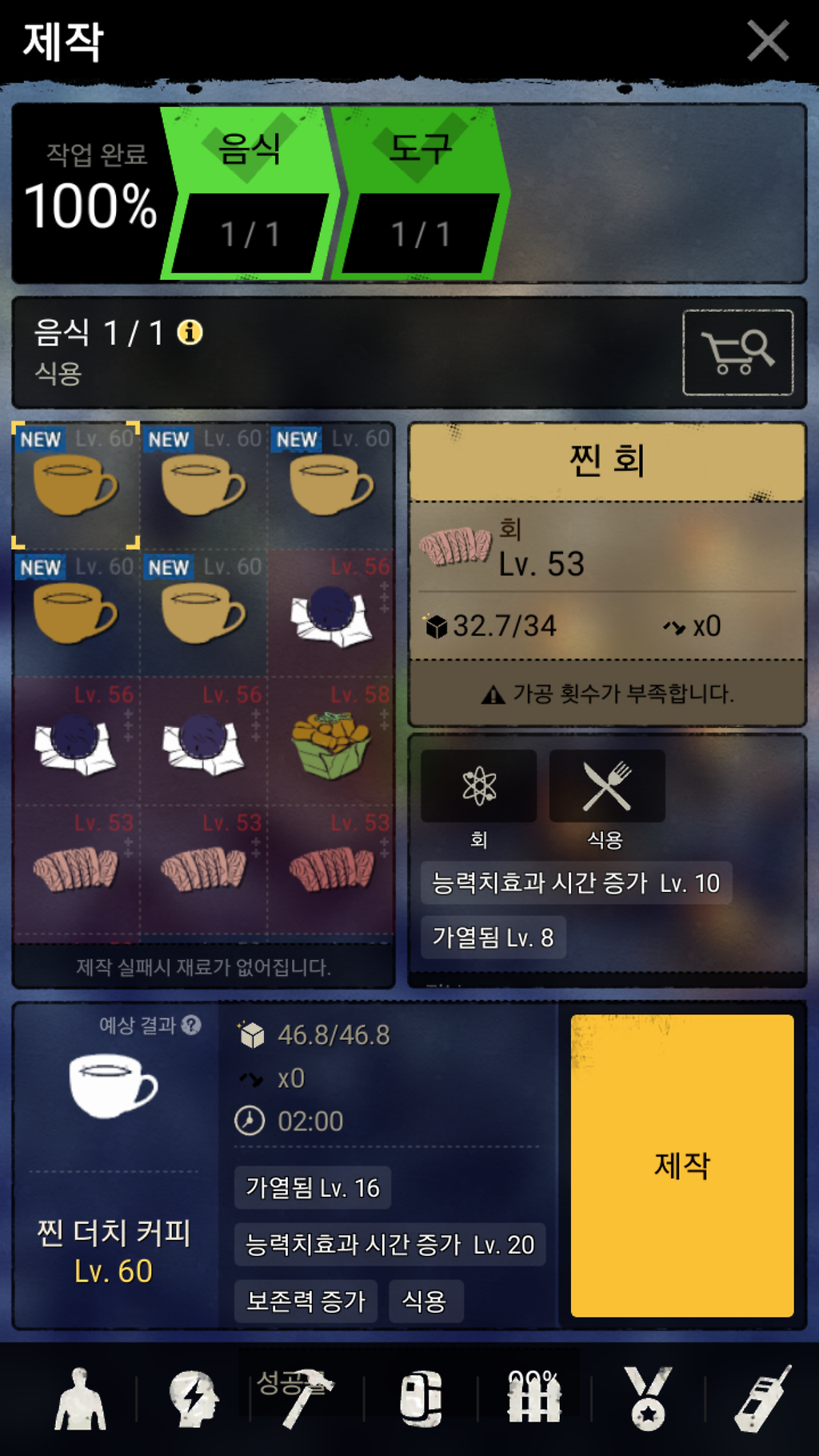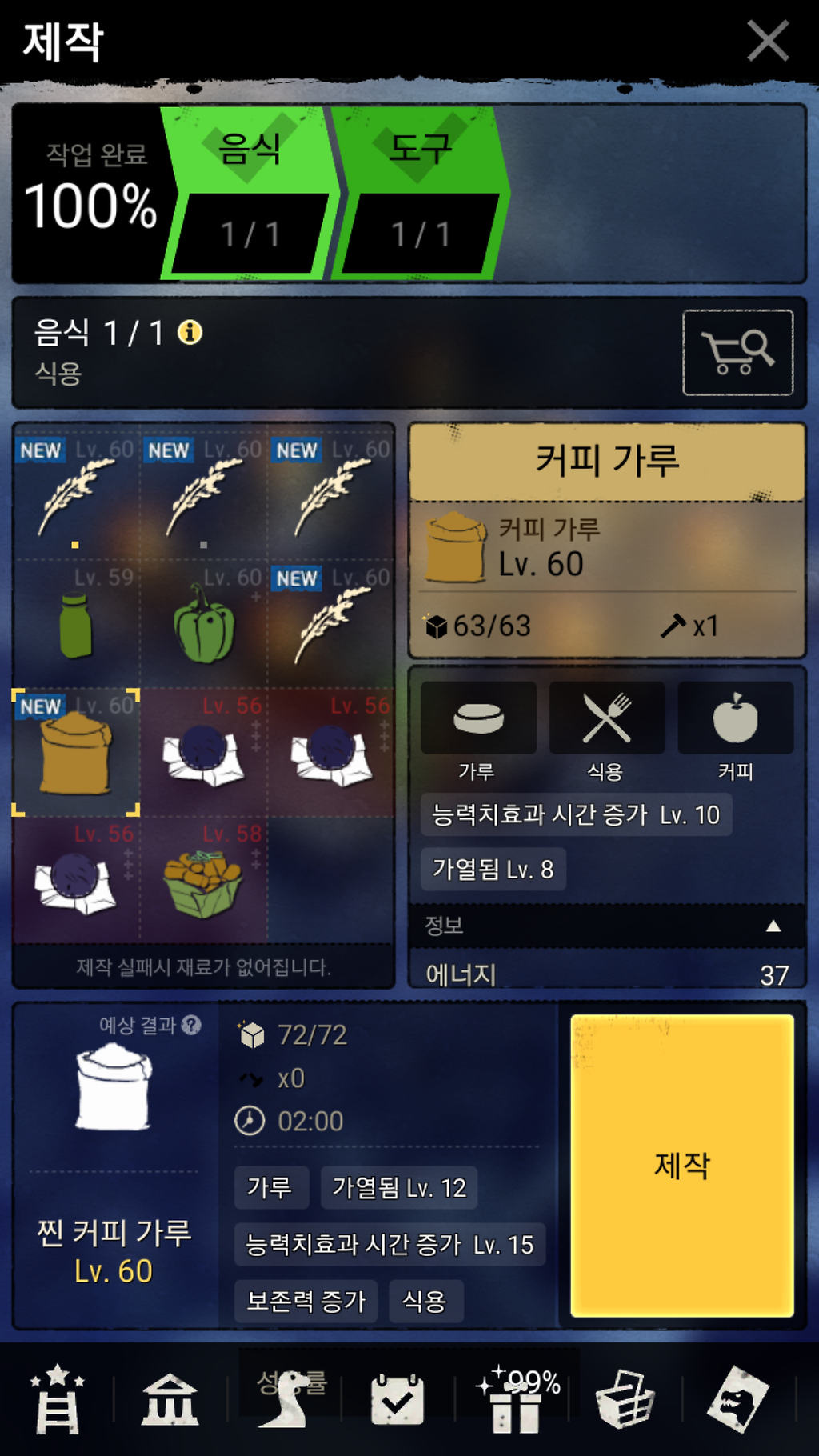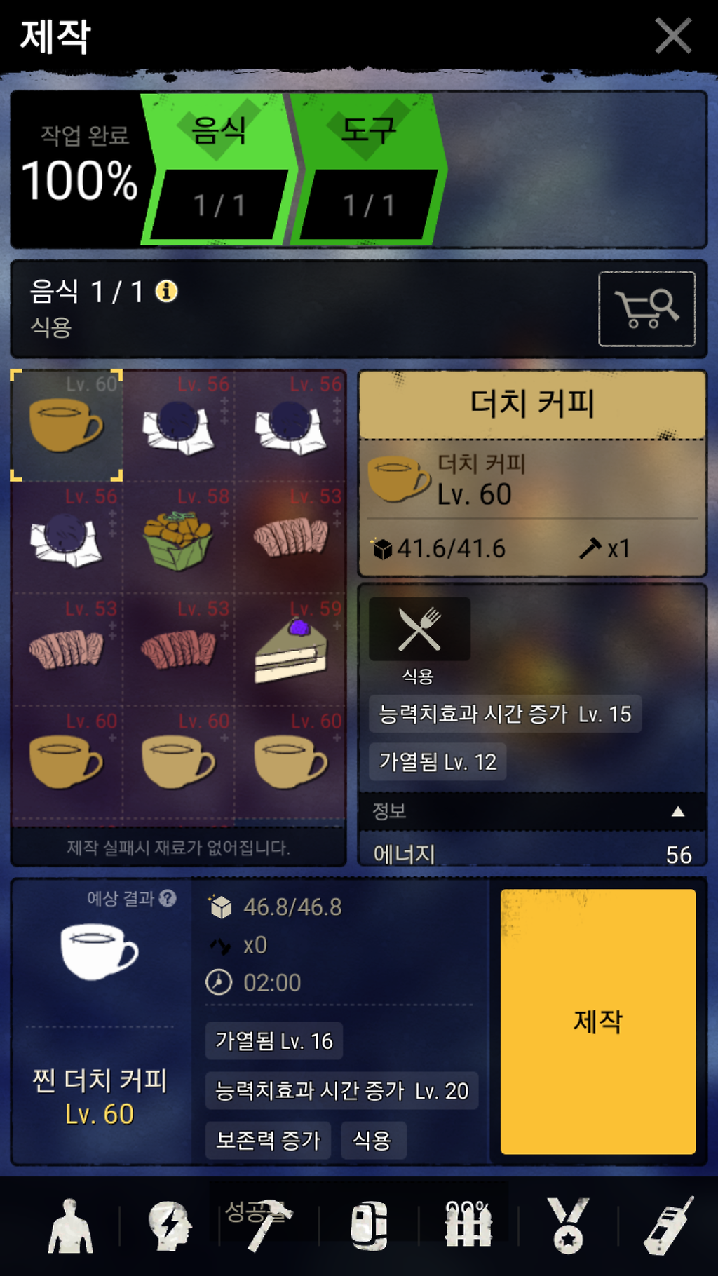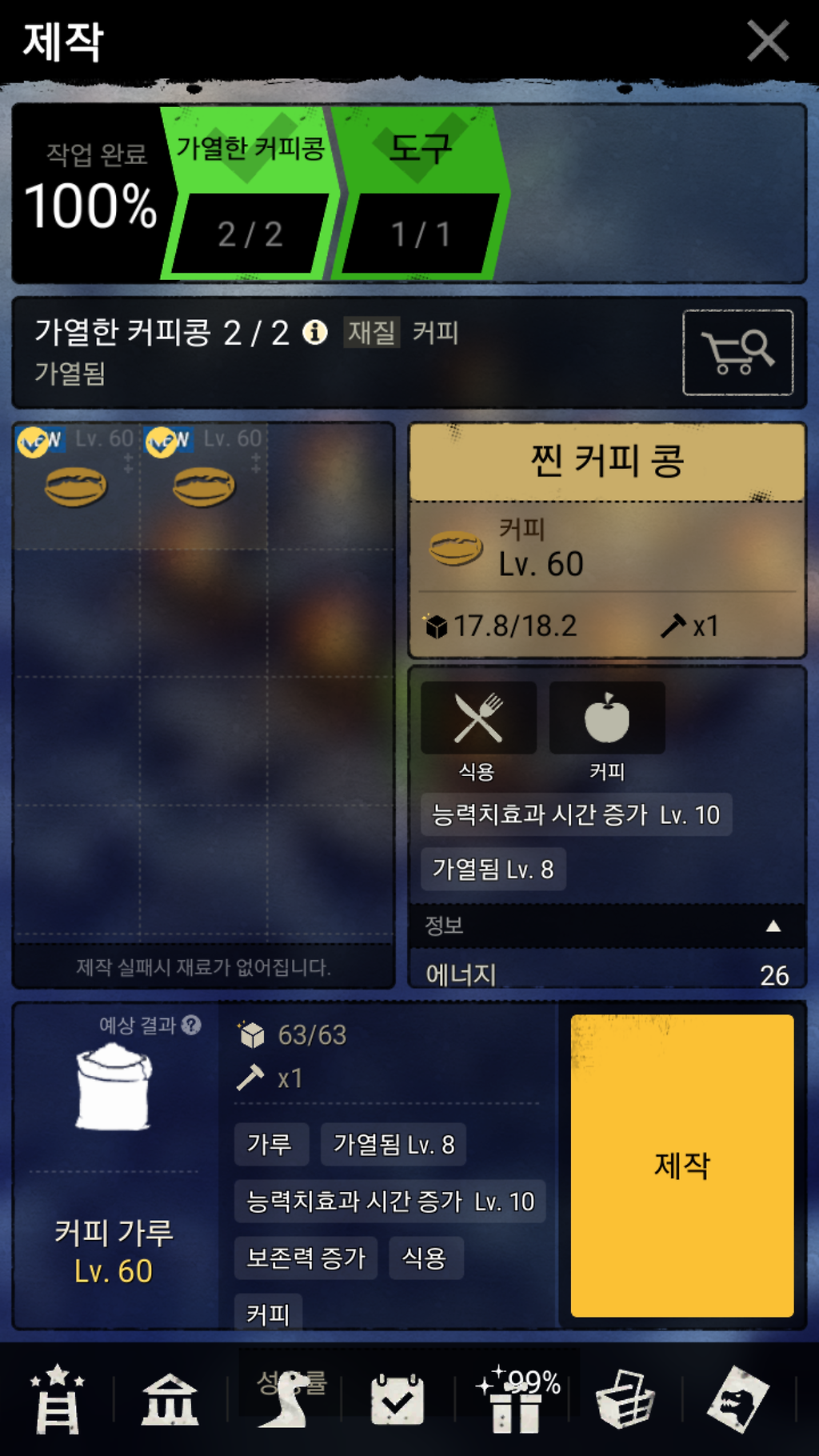 를 하면 능력치 증가 레벨20이 되며 한시간 9분의 지속시간을 갖는 더치커피가 제작됩니다.