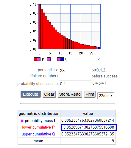 10번만에 성공할 누적확률이 65%에 불과합니다.
