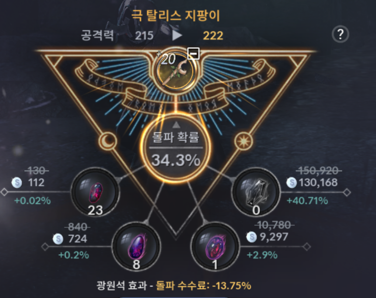 약 35개의 상급 블랙스톤이 소모됩니다. 블랙스톤 가격을 거래소 기준 약 11.3만원으로 잡고, 수수료를 0.92로 두면