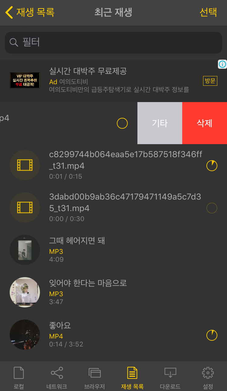여기서 또 해당 영상을 오른쪽에서 쓸어서