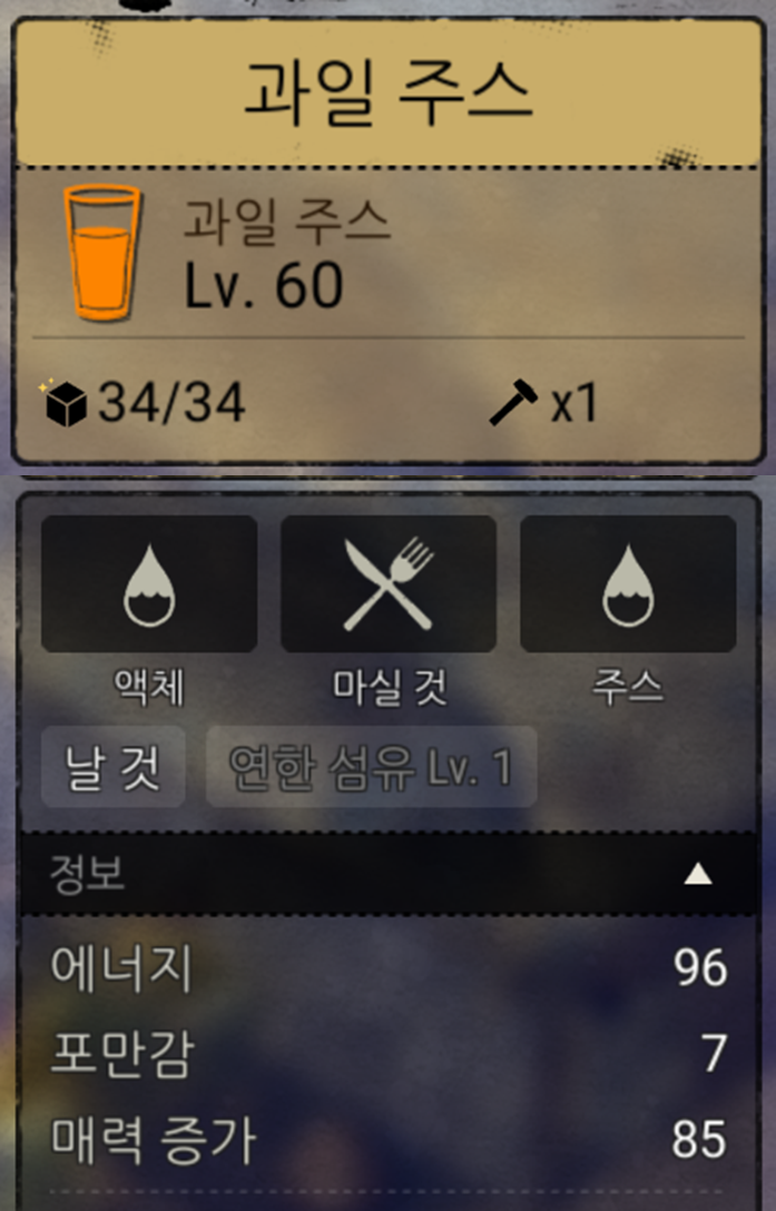 *레시피 - 과일4+물1 (절구 Lv이상, 작업대 15Lv이상)