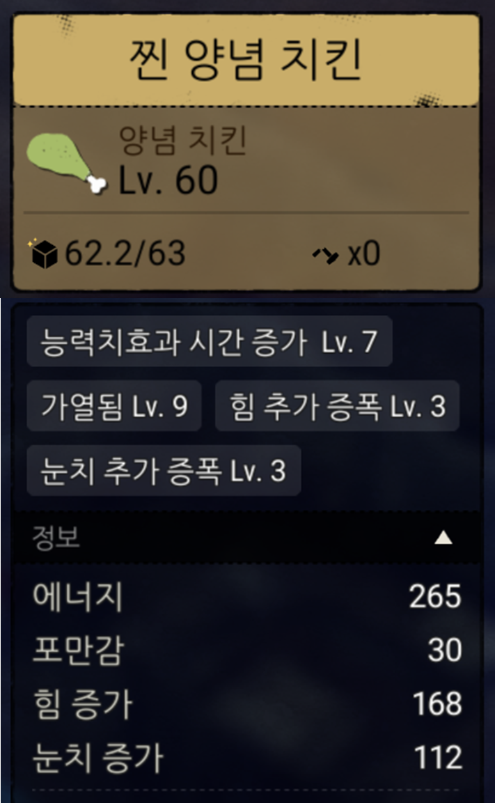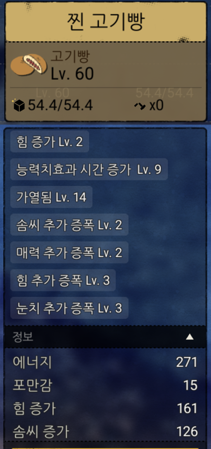 *레시피 - 고기1+곡물가루1+우유1+기름1+소스1 (요리용 불 Lv. 60, 프라이팬 Lv40이상)
