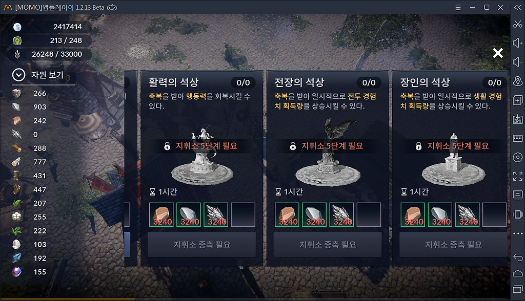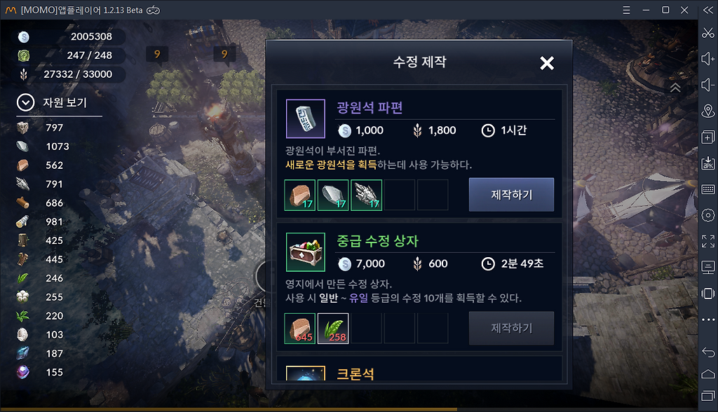 4. 파편 10개 모으면 광원석 제작가능.. 오우.. 마이.. 갓.. 1시간+식량양...