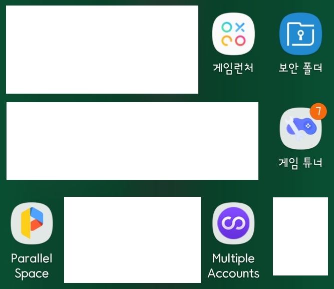 왼쪽부터, 기본 앱, 보안폴더 앱, Parallel Space 앱, Multiple Accounts 앱입니다.