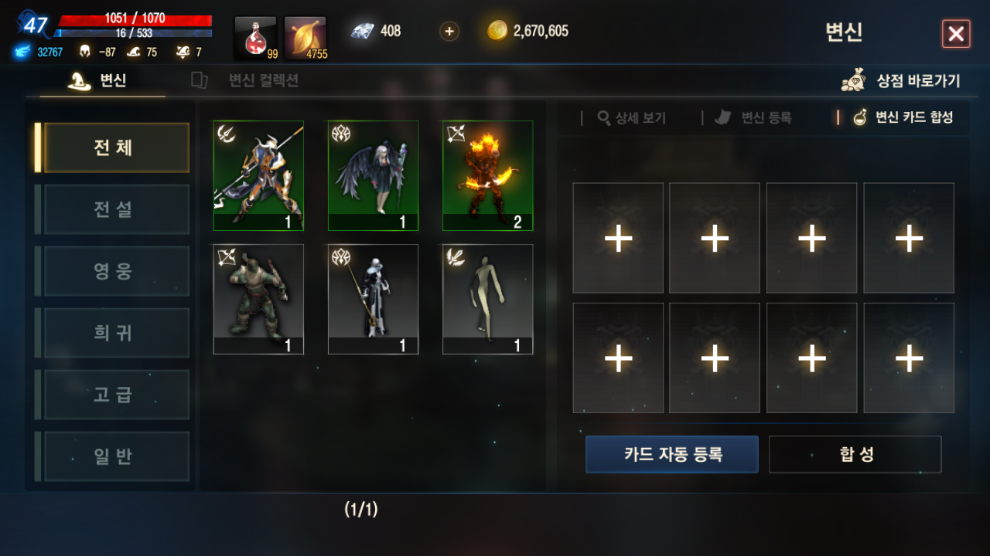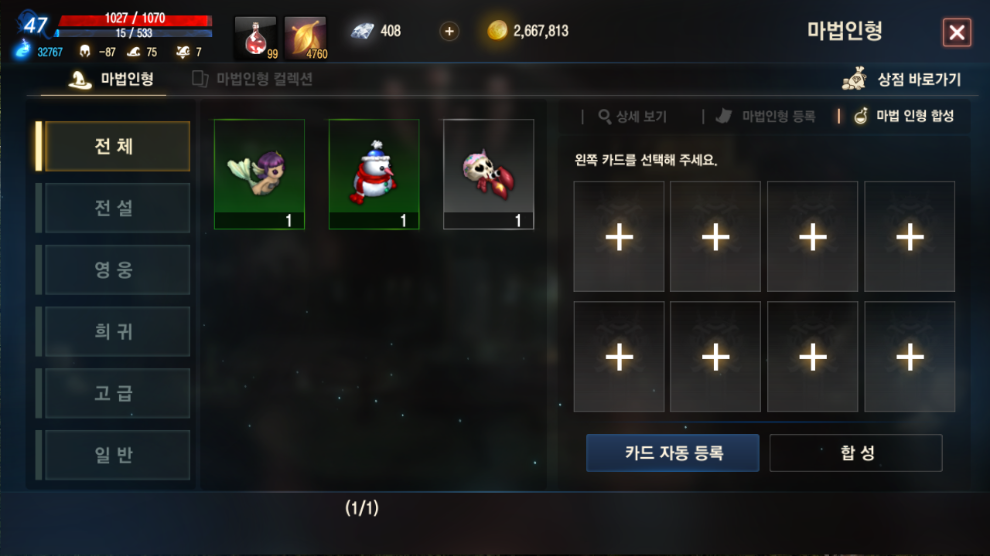 받은 퀘들 합쳐서 녹템 카드 4장이 만들어 졌고 캐릭 하나를 덜 키워도 될꺼라는 기대를 가지고 합성 도전..