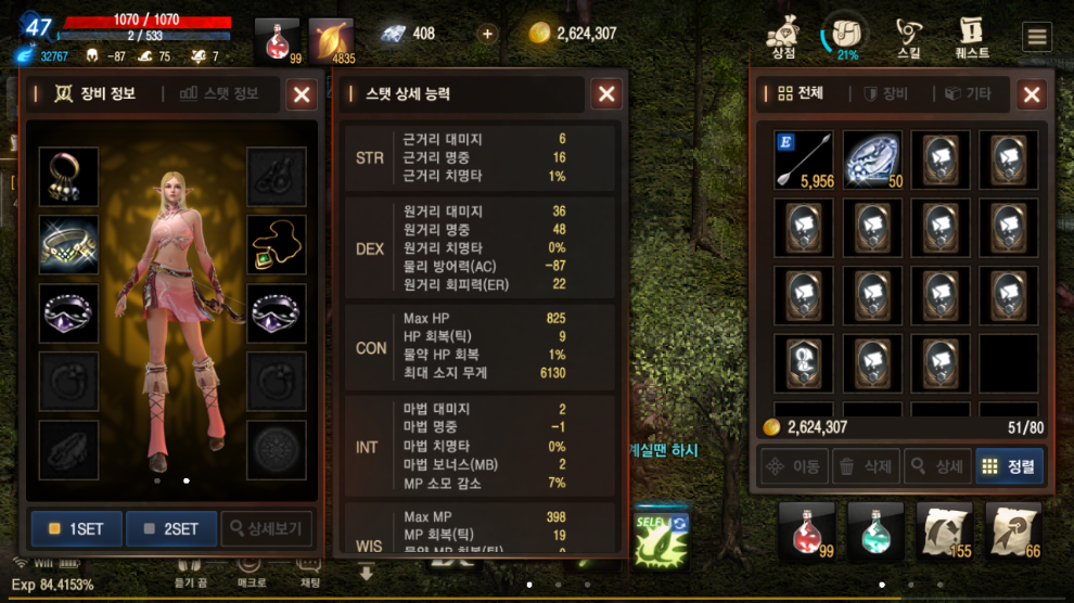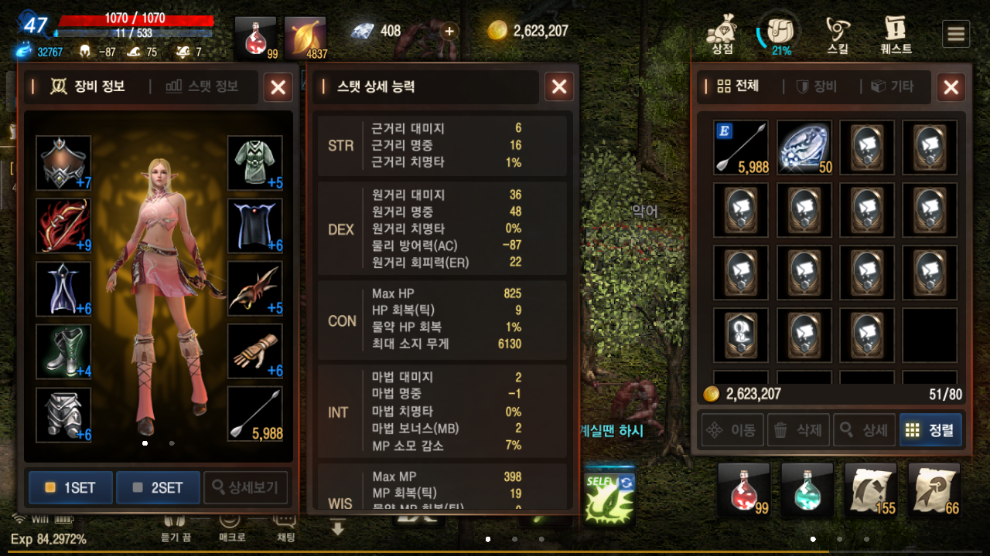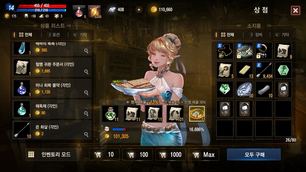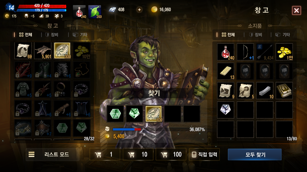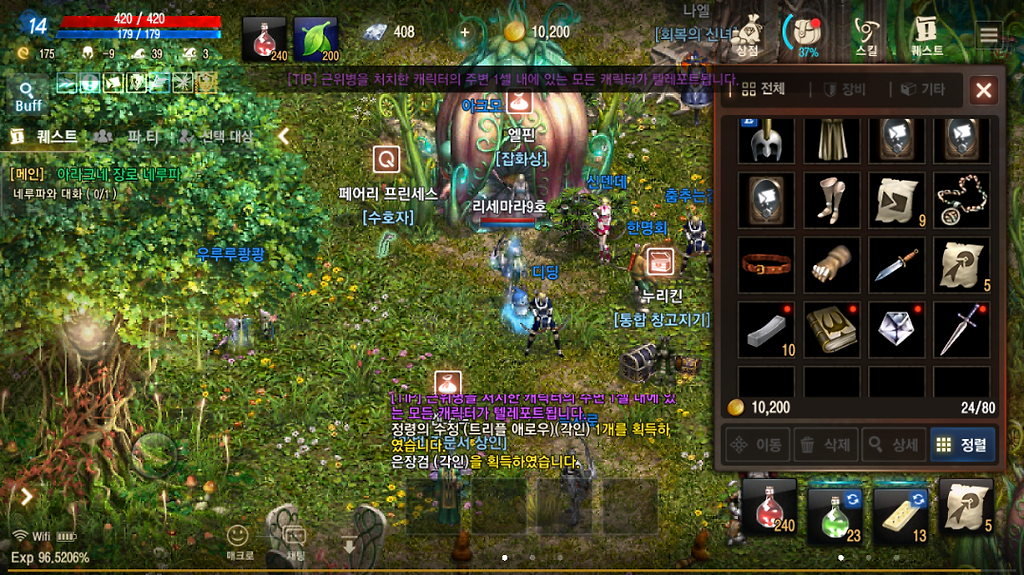 틈틈히 퀘 해서 받는 퀘템 잡템은 상점에 팔아주시고 물약은 비상물약 100개 정도씩만 남겨놓고 모두 창고에 맡겨주시면 좋습니다.