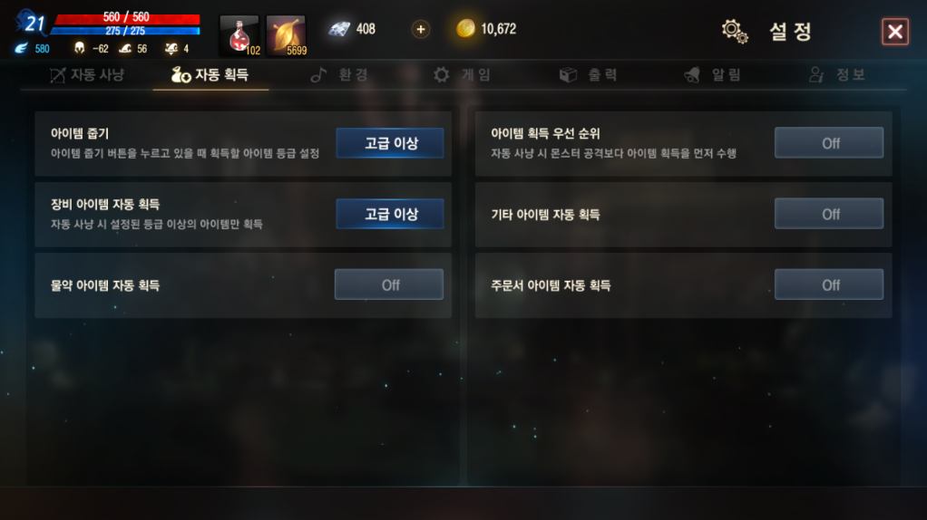 템 줍는거 해 놓으시면 오토 누르는 순간 잡템 줏으러 뛰어다니다 볼장 다 봅니다.