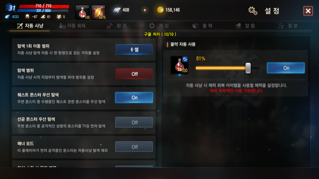 ※ 추가로 퀘스트를 보다 빠르게 진행하기 위한 셋팅을 설명 드리자면