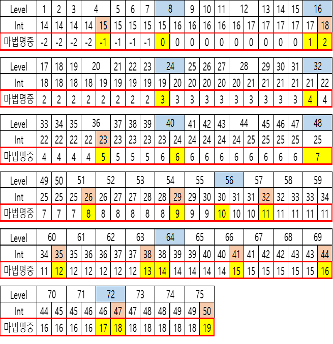 장비 및 버프로 인한 추가 INT없이, INT 50 찍을때까지의 마법명중을 계산해봤습니다.