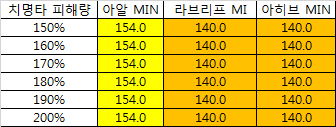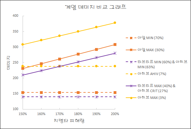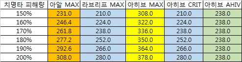 - 그 뒤로 치명타 피해량 170%를 기준으로 170% 이하일 경우 아히브, 170% 이상일 경우 라브리프가 더 높습니다.