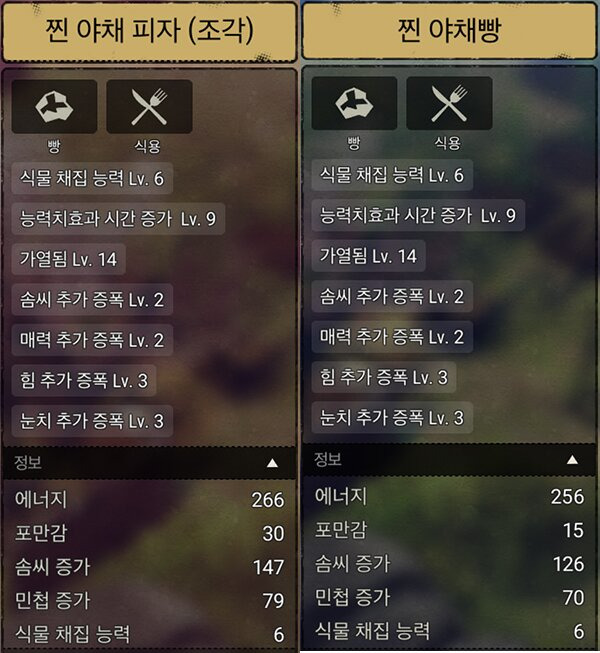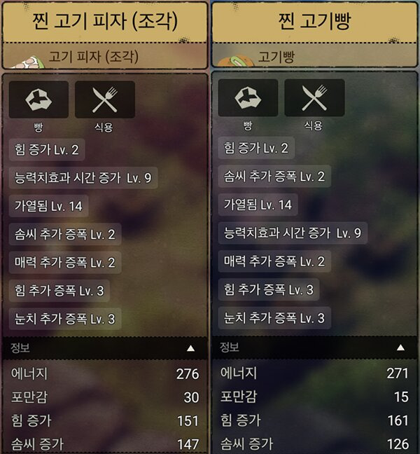 - 솜씨 스텟 증가를 원한다면 고기피자 / 힘 스텟 증가를 원한다면 고기빵