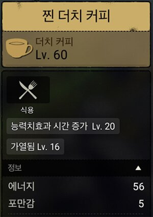 - 위의 레시피대로 제작하면 최대 피로도 120 증가 버프를 1시간 10분 동안 유지할 수 있는 더치커피 완성