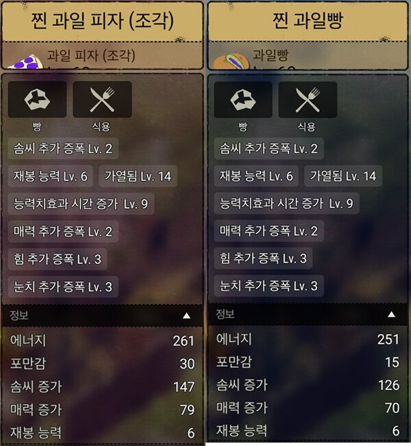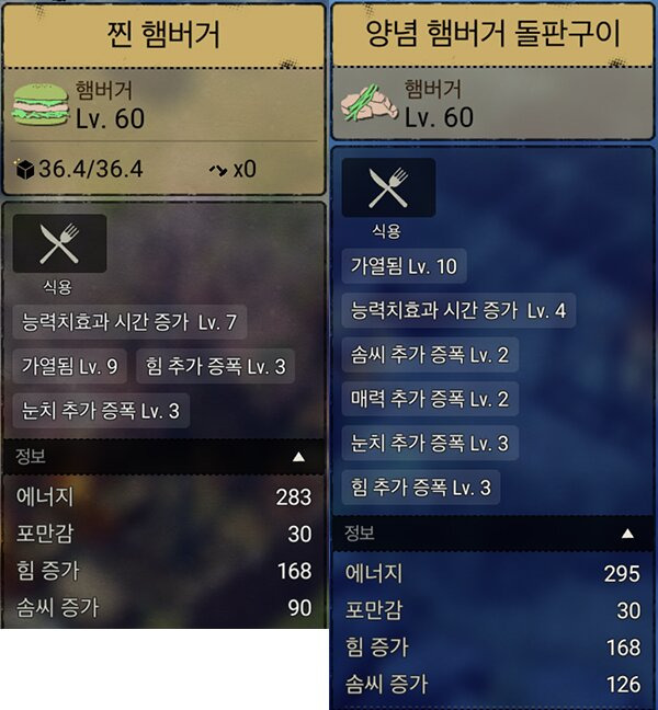 - 힘 스텟만 봤을때엔 앞서 비교한 햄버거와 동일 수치로 본문 힘증가 버프요리 中 가장 높다.