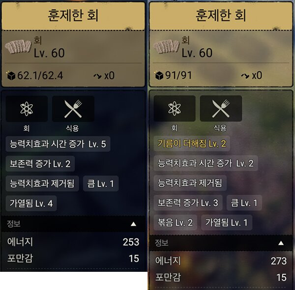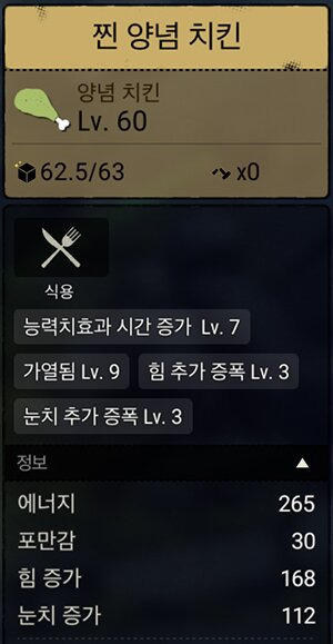 이 밖에도 에너지용으로는 회볶말, 회찜말, 회튀훈, 회훈돌, 스튜 등등 많지만 제작 재료 대비 효율을 따졌을 때 닥 회찜훈 추천.