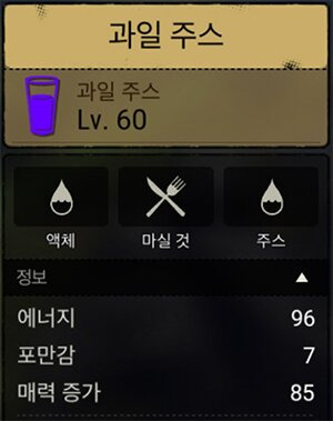 - 토마토 넣은 빵, 피자도 만들어 먹어 봤지만 요리능력6 외엔 필요없는 스텟이 많아 가성비 따졌을 땐 닥 과일주스