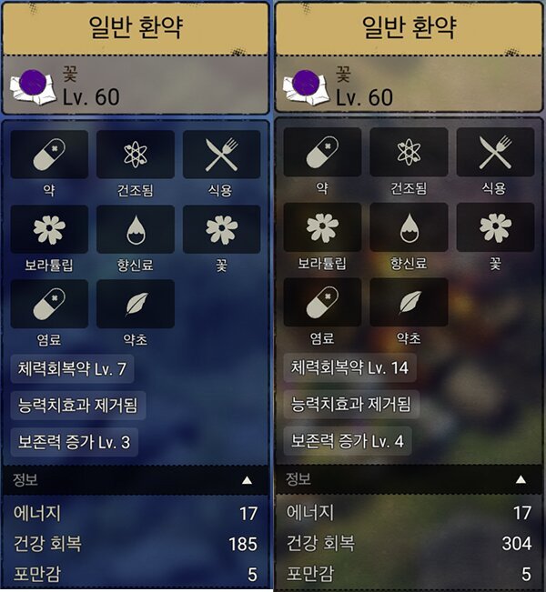 - 왼쪽은 일반환약 한번, 오른쪽은 일반환약 두번 한 수치 (환약 여러번 제조 = 건강 회복 수치↑)