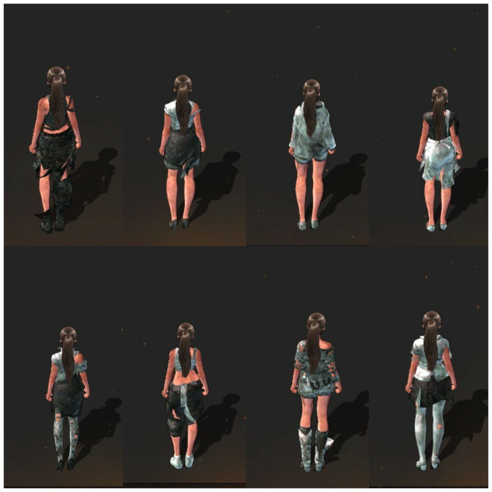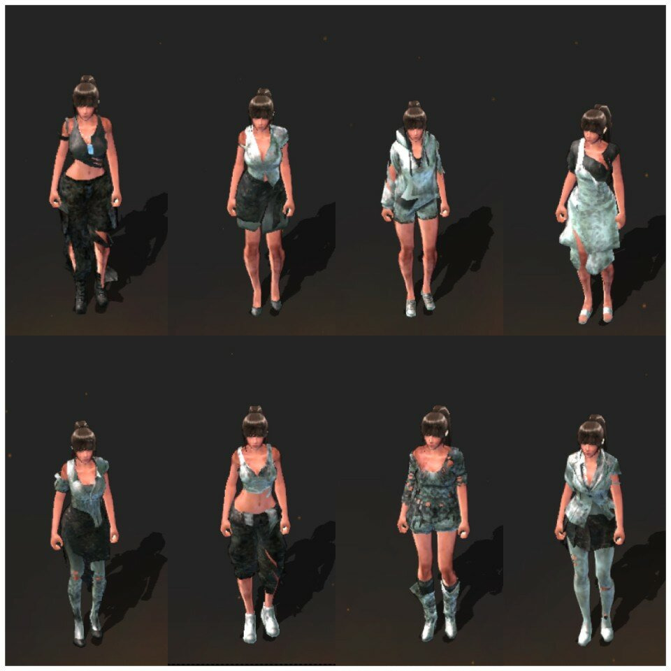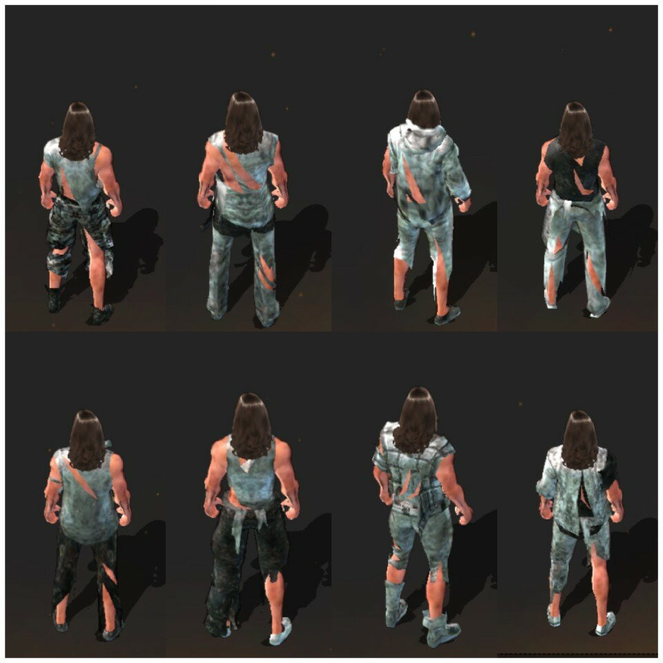 왼쪽 위부터 찢긴 전투복, 유니폼, 운동복, 주부복, 정장, 기술복, 농부복, 교복입니다
