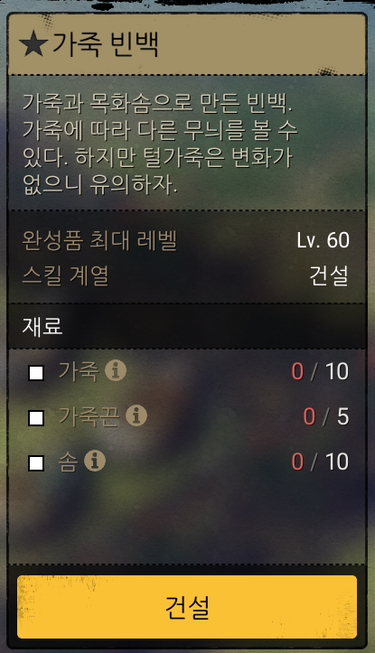 재료의 레벨과, 주재료인 가죽10장의 무늬만 신경써주시면 되는데,