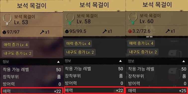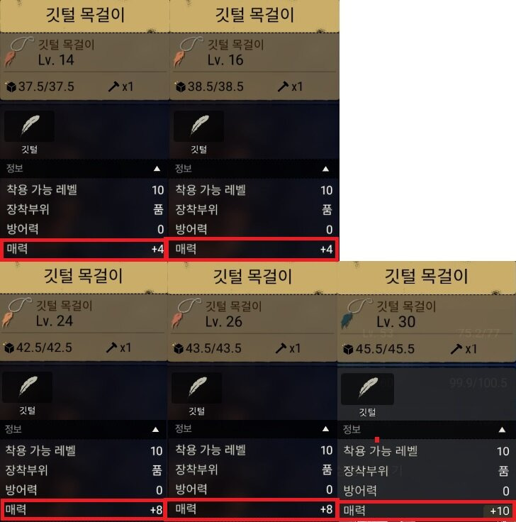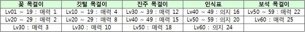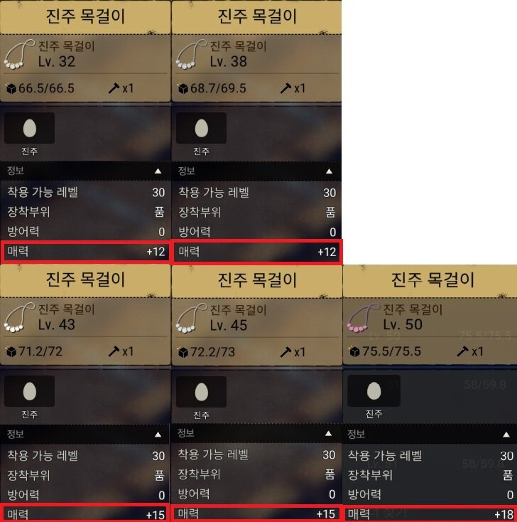 장신구는 꽃목걸이, 깃털목걸이, 진주목걸이, 인식표, 보석목걸이를 레벨대 구간별로 비교하였습니다.