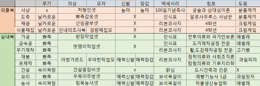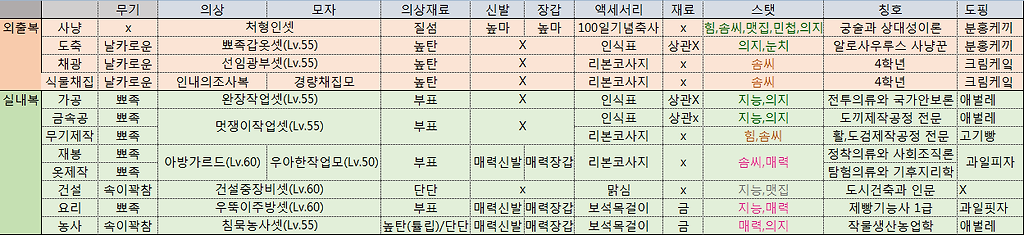 장비세트를 제작할 때, 맞춰야 할 장비의 레벨과 재료를 추가했고, 각 직업군에 영향주는 스탯을 기입했습니다.