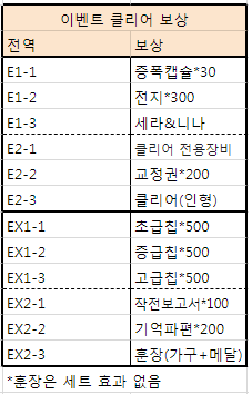 - 난이도 구분: 노멀 (E1-1 ~ E2-3), 맥시멈 EX1-1 ~ EX2-3 (E3-1~ E4-3)