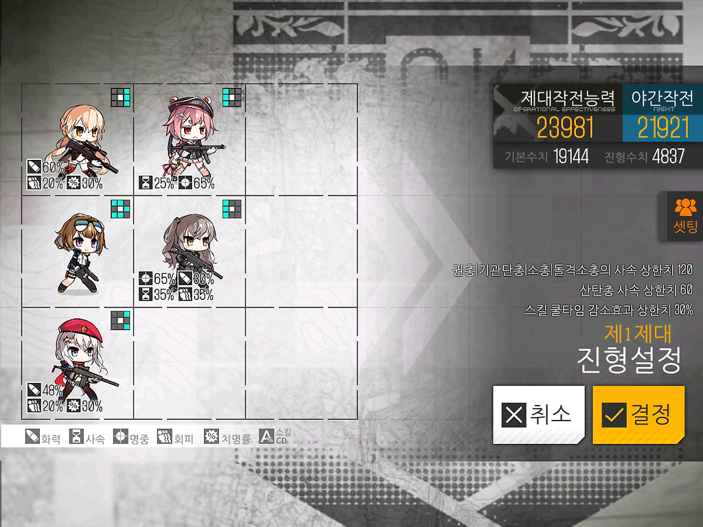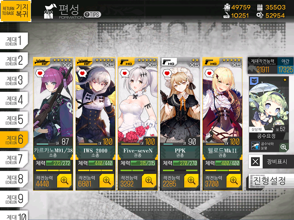 Mk23 - 야전화력지원 원탑입니다. 진형버프형태상 3AR 제대에 서브탱 자리에 기용했습니다.