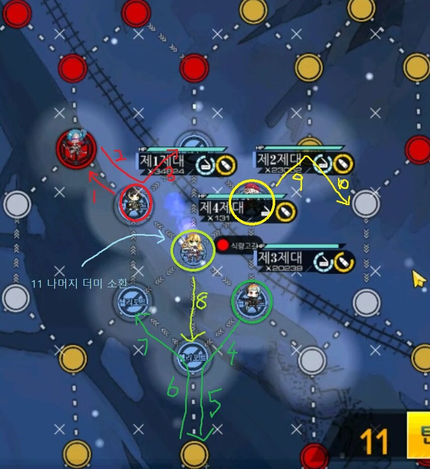 그 뒤에 차례대로 퇴각해준 다음 남은 인형으로 지뢰 사이를 지나가주면 되겠습니다.