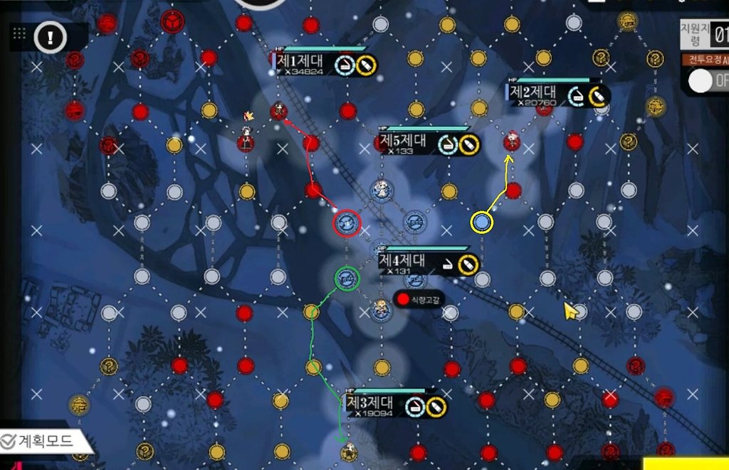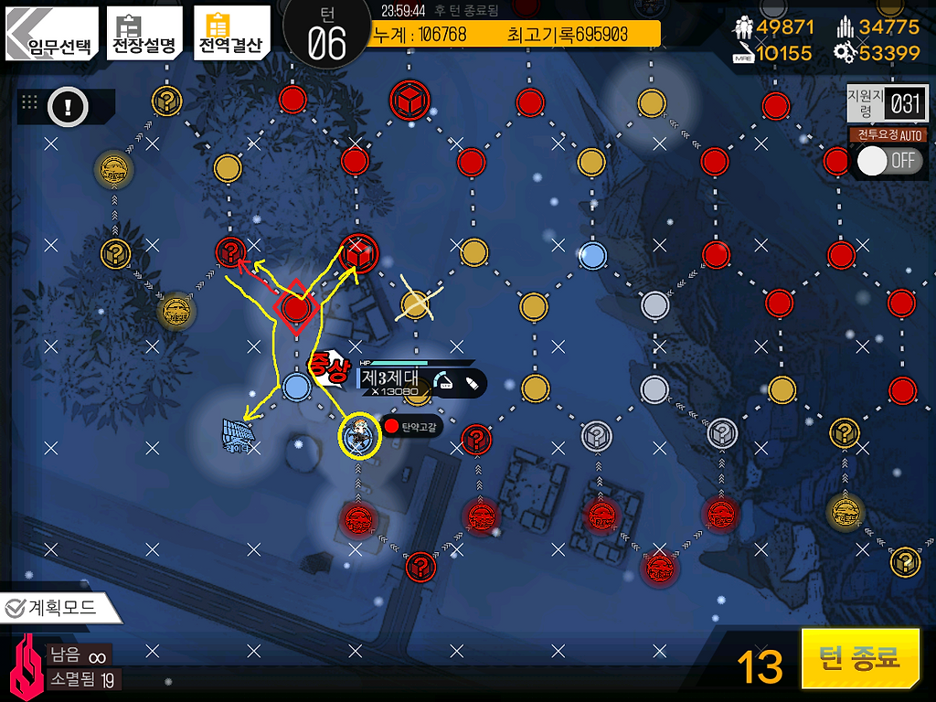 보급을 먹고 노란타일 위로 올라서서 적이 있을게 확실한 빨간마름모의 철혈을 마중나갑니다.