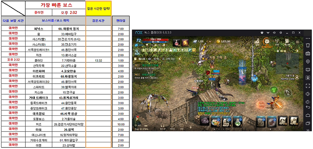 좌측에 보스타임 시트를 놔두구요, 우측에 녹스로 리니지M을 돌립니다.