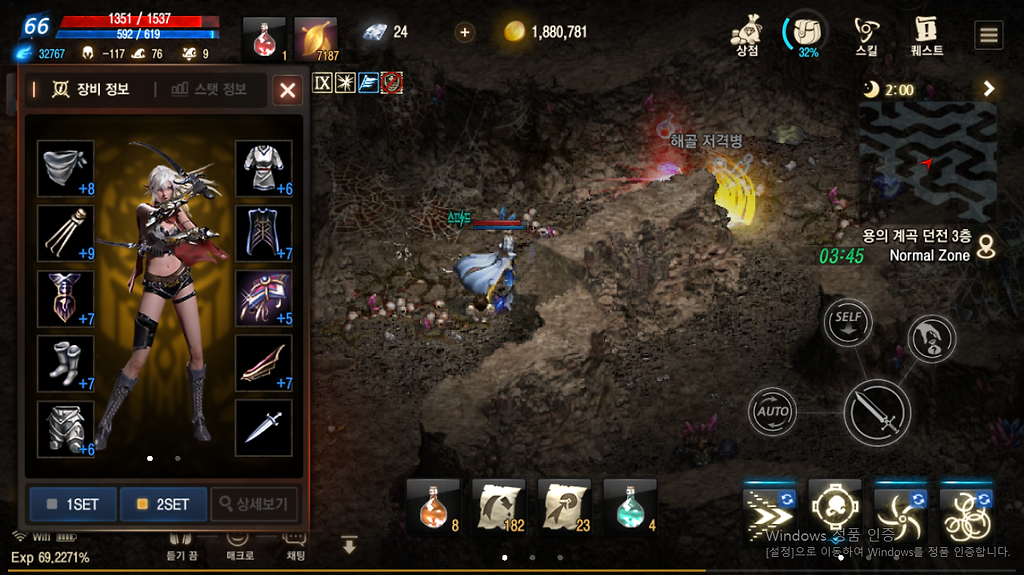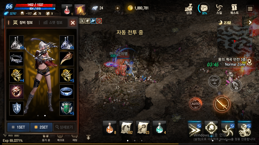 - 용의 던전 3층: 빨갱이 1000개 들고 1시간 15분 사냥