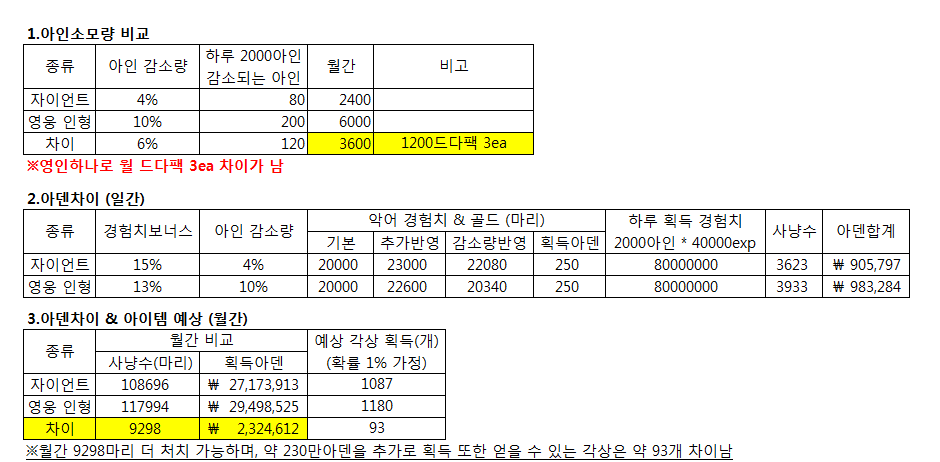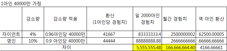 자료가 부족하여 추가 합니다. 아인감소량으로 인한 월간 경험치 획득량 차이이며 아인으로 역환산하였을 경우