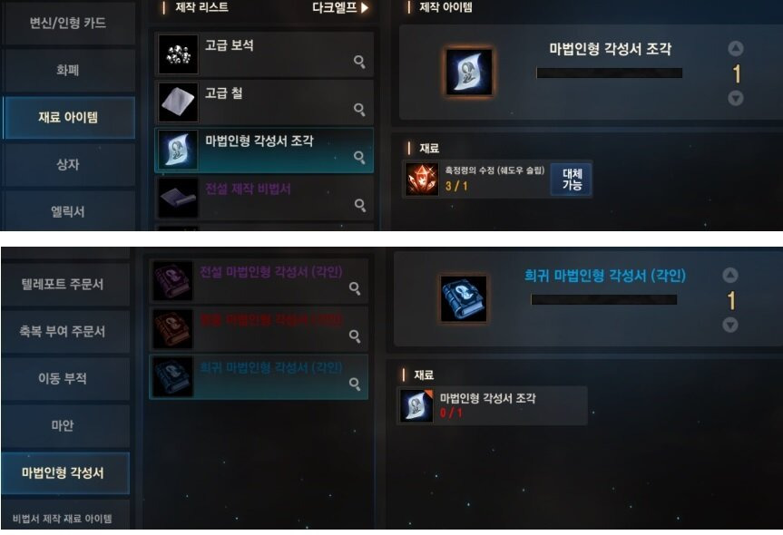 일단 제작으로 들어가셔서 재료아이템에 마법인형 각성서조각을 제작합니다.