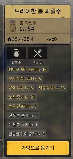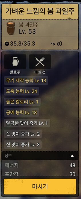 1. 과일 모으는 법페나코두스 작전 이벤트 섬 45렙 열대섬 이나 55렙 설원섬에서 캐옵니다.=> 대성공이면 좋다는 얘기를 들었는데 좋은 옵이 붙은 과일액을 시도 할 시에는과일액을 무한으로 섞어야하기 때문에 대성공 이든 아니든 상관이 없습니다.단, 실패는 뜨면 안됩니다. (피로도 감소 또는 몸에 해로운 작용을 주는 옵이 붙기 때문입니다.)2. 과일 액 만들기과일액을 만드려면 과일 2개와 설탕 1개 (또는 벌꿀 1개)가 필요합니다.과일을 따서 보면 옵이 3가지가 붙는데요.산도가 높음/ 당도가 높음/ 부드러운 과육 이 붙습니다. (안좋은 옵 제외)저는 과일주를 처음 만들 때는 과일액을 딱 한 번만에 제조해서 과일주를 만들었는데해보니 이 당시에 과일주에는 좋은 옵이 안뜨고 잡옵이 뜨더라구요.(예를 들어, 눈치 증가, 솜씨 증가, 채집능력 증가, 채광능력 증가 등.)물론 채집능력 증가와 채광능력 증가가 26렙 이상이 나오면 쓸만 한 옵이 되지만한번섞은 과일액으로 과일주를 만드면 26렙 이상 옵이 붙은 과일주가 나오기 힘듭니다.=> 제가 드리는 과일액 만드는 팁1) 과일액을 처음으로 만들 때는 옵 상관없이 막 섞습니다.(왜냐하면 애초에 따온 과일의 옵은 1~2레벨이 대부분이며 3레벨옵은 드물고 4~5레벨옵은 거의 없다고 보시면 되기 때문입니다.)2) 완성된 과일액으로 한번 더 섞을 때는 옵을 보면서 섞으면 높은 레벨의 옵션이 붙습니다.=> 과일액 옵션 레벨 높이는 법과일액을 두번째로 섞을 때부터의 결과는 랜덤이지만 같은 옵의 똑같은 레벨 과일액끼리 섞을시에높은 확률로 한단계 레벨이 높은 옵이 과일액에 붙습니다.ex) 산도가 높음 LV.2 + 산도가 높음 LV.2 = 산도가 높음 LV.3당도가 높음 LV.2 + 당도가 높음 LV.2 = 당도가 높음 LV.3부드러운 과육 LV.2 + 부드러운 과육 LV.2 = 부드러운 과육 LV.3여기서 주의하셔야 할 점은 왠만하면 같은 옵끼리 과일액을 섞으셔야 합니다.그러지 않으면 옵의 레벨이 높아지는건 힘들기 때문입니다.3. 특수한 옵 (나무향이 나는, 과일향이 나는)이제 봄 과일주를 만드는데 관심이 제일 많으신 특수한 옵에 대해서 얘기를 하려고 하는데요.이 전에 인벤에도 올라왔듯이,나무향이 나는 => 도축능력 증가 or 건축능력 증가, 가구제작 능력 증가 or 공예 능력, 무기 제작 능력 증가과일향이 나는 => 방어구 제작 능력 증가, 재봉 능력 증가 or 요리 능력 증가, 농사 능력 증가각각 이 옵션 중에 하나가 랜덤으로 붙습니다.(랜덤이라 그런지 특수한 옵이 붙은 경우인데도 위의 옵션이 하나도 안 붙은 경우가 있었습니다.)1) 나무향이 나는 옵을 발현 시키는 법나무향이 나는 옵이 발현 되기 위해서는 산도가 높음 옵 끼리 섞어서 과일액을 만들어야 합니다.저같은 경우는 산도가 높음 LV.4 + 산도가 높음 LV.4 = 나무향이 나는 LV.1~2 가 나왔습니다.=> 산도가 높음 끼리 조합을 해야 랜덤으로 나무 향이 나는 옵이 붙는다.여기서 산도가 높음의 옵 레벨이 높아야 하므로 바로 위에서 과일액 옵 레벨을 높이는 방법으로과일액 레벨을 우선으로 높인 후에 그 결과물 끼리 조합을 합시다.2) 과일향이 나는 옵을 발현 시키는 방법과일향이 나는 옵이 발현 되기 위해서는 부드러운 과육 옵 끼리 섞어서 과일액을 만들어야 합니다.저같은 경우는 부드러운 과육 LV.4 + 부드러운 과육 LV.4 = 과일향이 나는 LV.1~2 가 나왔습니다.=> 부드러운 과육 끼리 조합을 해야 랜덤으로 과일 향이 나는 옵이 붙는다.여기서 부드러운 과육의 옵 레벨이 높아야 하므로 바로 위에서 과일액 옵 레벨을 높이는 방법으로과일액 레벨을 우선으로 높인 후에 그 결과물 끼리 조합을 합시다.밑에 사진은 제가 며칠동안 만들었던 과일주의 옵들입니다.나무향이나는 또는 과일향이나는 옵의 레벨이 1~2 짜리로 만들어서 옵 렙이 낮은 편인데이 옵들의 레벨이 높아질수록 결과물의 옵 레벨도 높아질 것으로 예상됩니다.저는 이 완성품들을 쟁여 놓으려다가 자꾸 쌓이고 먹는 사람도 없고 해서장미 볼티미어 섬에 몇 개 씩 올리고 있는 중입니다. ㅎ낮지 않은 가격으로 올렸지만 꽤나 쏠쏠하게 돈이 들어옵니다.봄 과일주는 많은 분들이 아시다시피 랜덤으로 옵이 붙기 때문에딱 이렇다 정해서 말하기가 힘들어서 제가 만들었던 경험에 의해 쓴 점 양해 바라구요.계속 만들다보니 아 이렇게 하면 어떤 옵이 붙겠구나 조금씩 감이 온 것들을 써내려왔습니다.