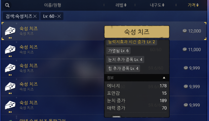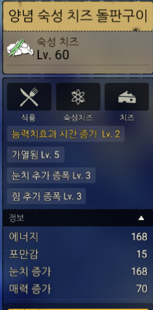 다음은 도축용 도핑 음식인 숙성치즈랑 대성숙성치즈를 보겠습니다