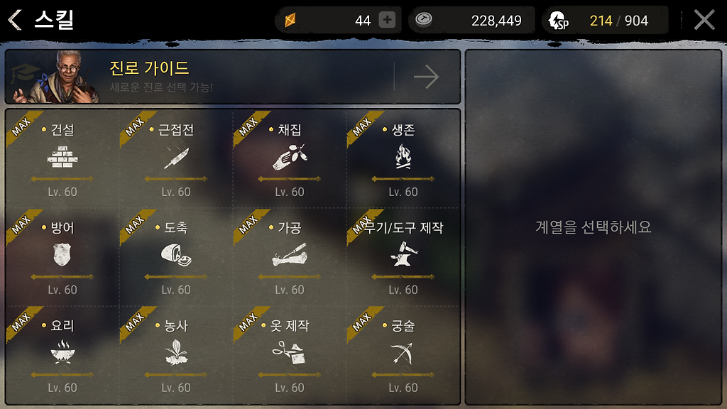 1.생존 ㅣ2.채집ㅣ3.가공ㅣ4.근접전ㅣ5.방어ㅣ6.궁술